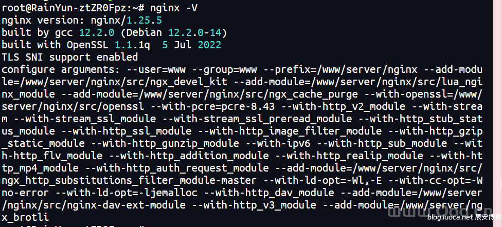 安装完成后,使用 nginx -V 查看编译详情: