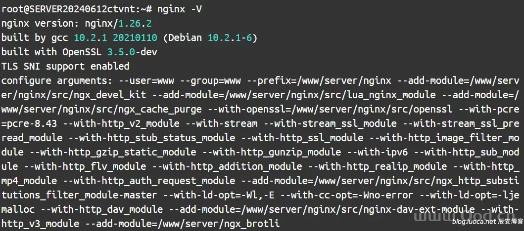 截止目前宝塔Linux面板9.5,软件商城里面的nginx,无论什么版本进行编译,使用的OpenSSL版本都是1.1.1,以目前最新NGINX 1.26.2 为例,使用nginx -V可查看编译详情: